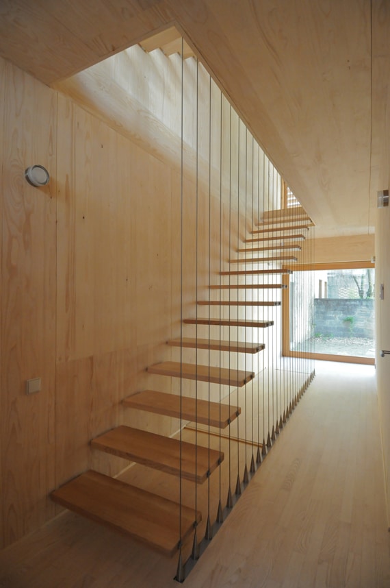 Fidèles à leurs convictions en matière de préfabrication et de filière sèche, les architectes de Tectoniques proposent une construction préfabriquée intégralement en bois. Outre ses avantages en terme d’éco-construction, le procédé assure un chantier rapide et bien adapté au contexte contraint et exigu de l’opération. Les panneaux en bois massifs contrecollés (plis croisés de bois massif) forment murs, planchers, et refends. Sur le plan constructif, ils s’apparentent aux parois de béton armé, utilisées dans la construction traditionnelle, mais dans ce cas, le montage est purement mécanique et “à sec”. Ils sont préfabriqués par l’industriel autrichien Binderholz et préparés en atelier, puis livrés et assemblés par l’entreprise Arbosphère, spécialisée dans ce procédé constructif. L’essence choisie est le sapin blanc, qui offre une matière claire et très homogène (veinages peu marqués et absence de nœuds). Les panneaux arrivent sous forme de macro-composants, dans l’ordre de montage, prêts à être assemblés. La conception est longue, la construction rapide. Cinq jours de montage seulement ont été nécessaires pour la structure de la maison.