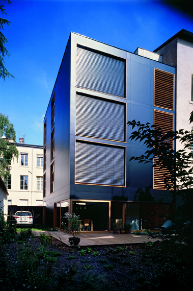 La façade sur rue, à l’Est, considérée comme la plus litigieuse en terme de vis-à-vis, est pratiquement sans ouverture. Elle présente une figure silencieuse et abstraite. Seule une bande verticale vitrée sur toute sa hauteur et habillée d’une claustra bois, éclaire l’escalier et laisse deviner la vie intérieure sans trahir l’intimité des habitants. Des ouvertures horizontales, placées dans un bandeau en retrait, assurent discrètement l’éclairement naturel et la ventilation du rez-de-chaussée, sans être visibles de la rue.