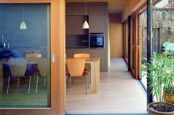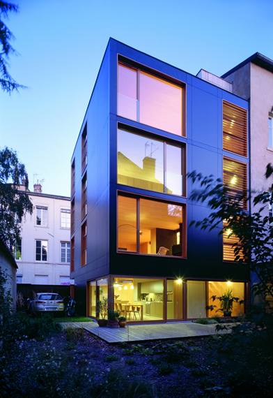 Les architectes lyonnais de Tectoniques jouent la carte de la contradiction avec cette maison particulière installée à la Croix-Rousse à Lyon. A la façade noire et opaque sur rue, s’oppose une façade ouverte en jardin laissant entrevoir la clarté d’un intérieur en chêne blanc. Profitant de l’alignement volumétrique des petits immeubles voisins, les architectes n’hésitent pas à s’élever sur quatre niveaux, une hauteur qui est fièrement assurée par le jeu des garde-corps de l’escalier. Tectoniques mène la visite :