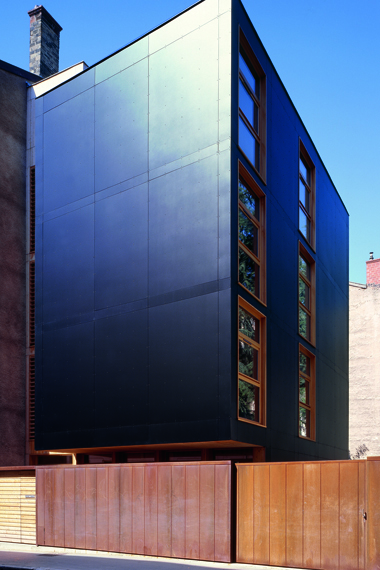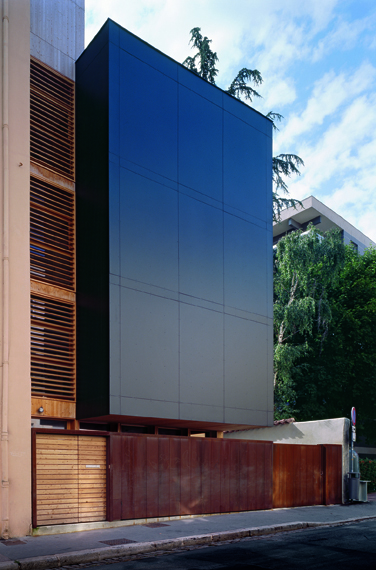 Au Sud elle s’adosse au pignon voisin, et achève ainsi la séquence classique, tandis qu’au Nord, elle propose une façade principale ouverte sur la perspective de la rue, entérinant la fin des immeubles d’alignement et des pignons aveugles. Cet effet de décalage est accentué par le traitement subtil du seuil d’entrée. Une épaisseur est créée entre le portail en acier prépatiné et l’entrée de la maison, séparant les domaines publics et privés, ménageant un vide sur le rez-de-chaussée capable de donner de l’élan à ce grand volume en porte à faux.