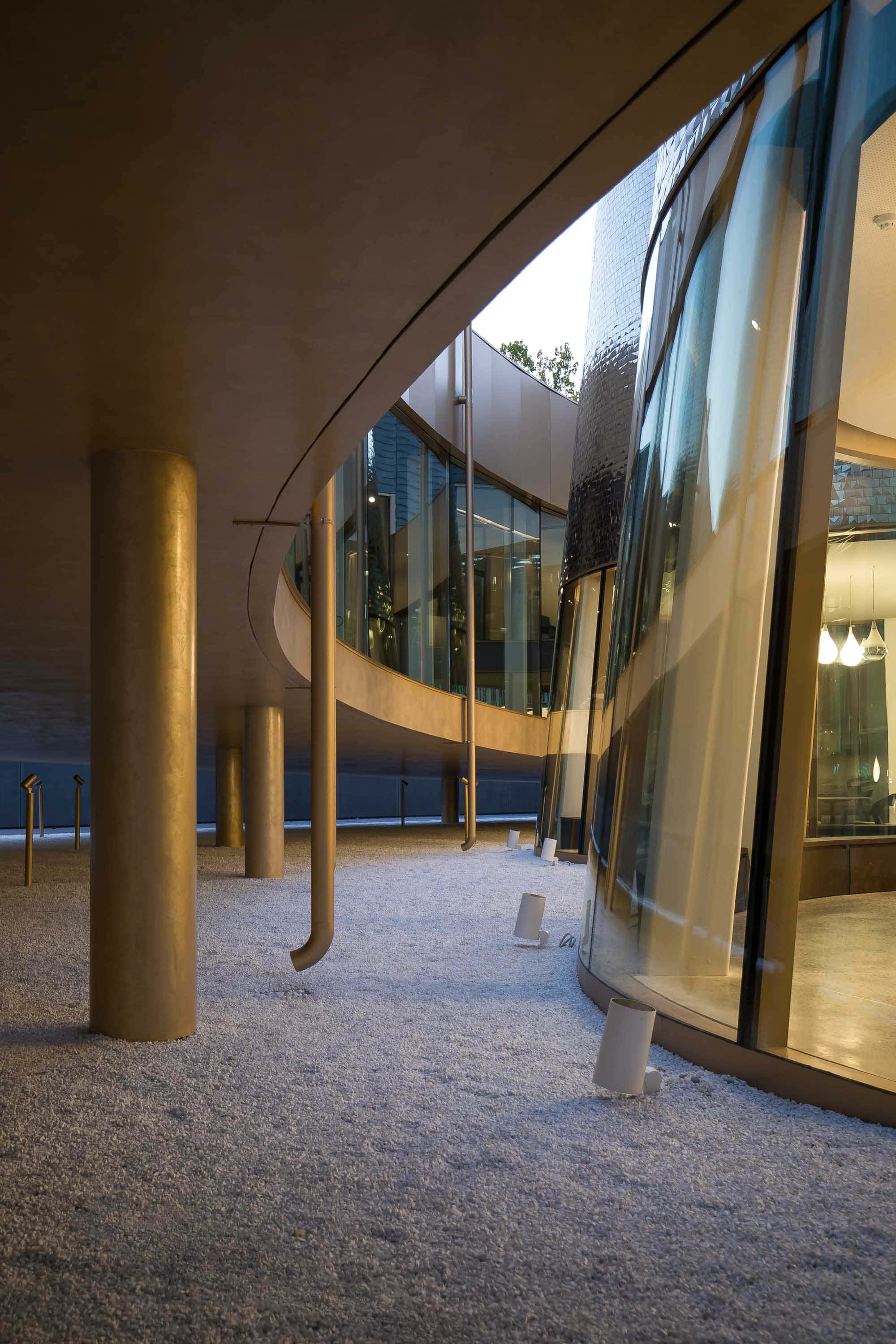 Le cœur du projet est construit autour de cônes étincelants. Ils abritent deux salles de formation, un espace scénographique, la banque d’accueil ainsi qu’un escalier pour le plus petit cône. Ces volumes sont quant à eux revêtu de céramique, dessinés par l’architecte et fabriqués par Casalgrande Padana.