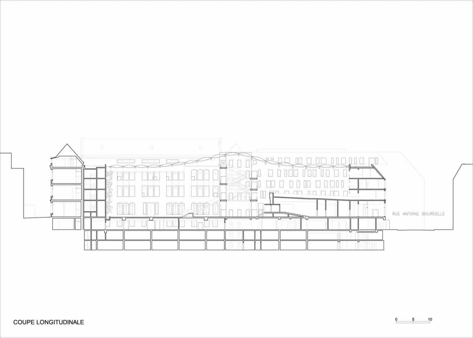 Le bâtiment se distingue par sa gaité en relation avec son environnement. Sur cette parcelle, où plutôt les 23 parcelles que l’on a assemblé, les architectes ont souhaité conservé le bâtiment de 1908, leur extension s’aligne avec les bâtiments haussmannien avec cette couleur jaune, après le pli au carrefour, la façade vient se courber face au musée Antoine Bourdelle avec une couleur rouge afin de délimiter la cour. L’agence a conçu des joints creux pour délimiter les bâtiments rénovés et l’extension. Les bâtiments existants ont été réhabilités de manière à leur rendre leurs aspects d’origine, les traces d’extensions de 1954 ont été effacées.