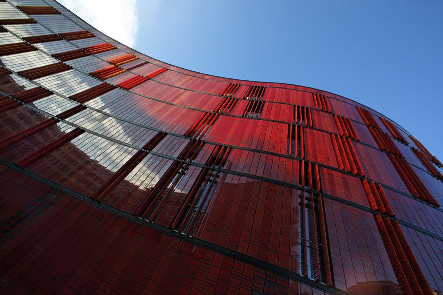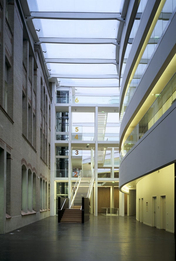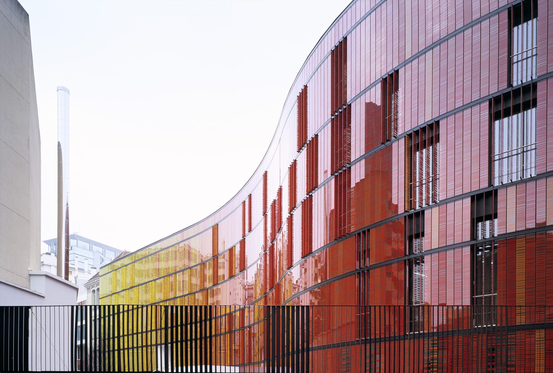 L’extension est en contraste avec le traitement de la façade du bâtiment d’origine, la rugosité de la brique laisse place à la douceur de ce chromatisme. Selon la position du visiteur et l’instant d’observation, la couleur de la façade varie du pastel au fluorescent. Les utilisateurs participent également à la vie du bâtiment, les lamelles de verres translucide de près et opaque de loin, s’orientent de manière verticale, laissant pénétrer le soleil l’hiver et s’en protéger l’été. La sérigraphie et le chromatisme sont issus d’une équation mathématique. De sept couleurs, quatre motifs, au recto et verso, sept hauteurs différentes, résultent huit cents soixante-treize références pour quatre mille cents deux éléments mis en œuvre.