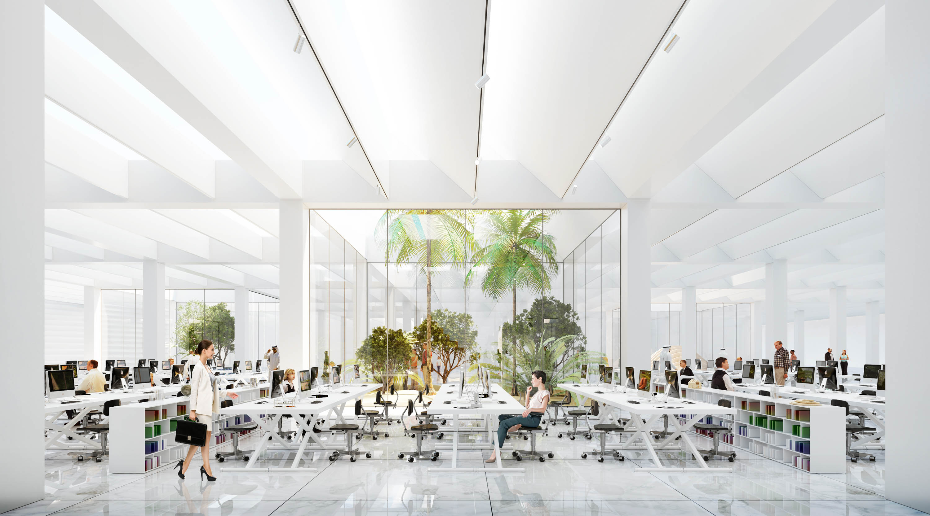 Les principaux locaux se logent ainsi sous la toiture. Des patios permettre aux visiteurs de prendre l’air sans être dérangé par le sable. Les architectes de BIG ont notamment profité de la porosité du cœur du bâtiment pour planter de la végétation.