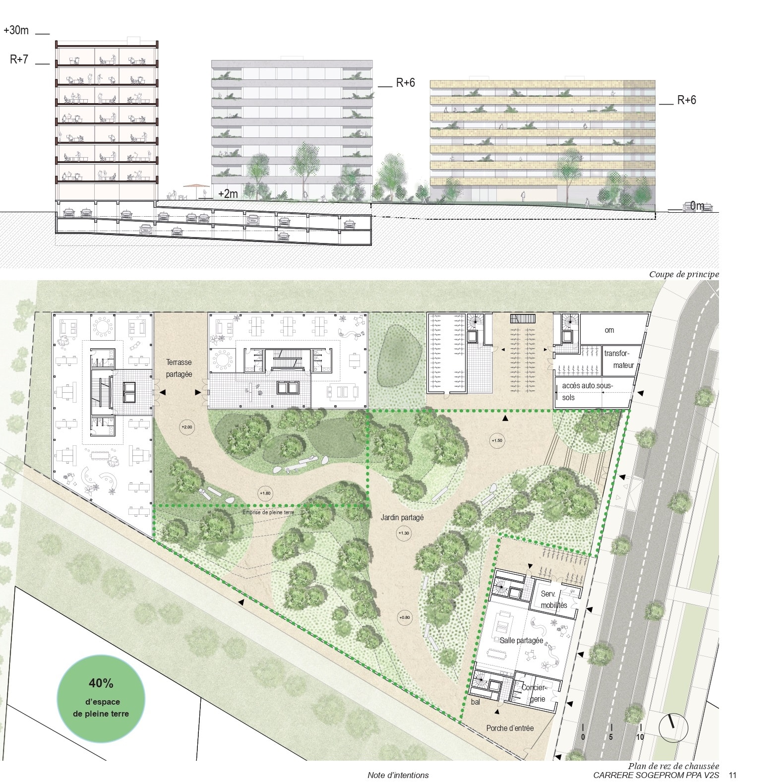 Le projet s’insère sur une parcelle trapézoïdale, quatre bâtiments viennent se poser aux limites de celle-ci afin de créer un cœur d’ilot végétalisé. L’initiale sera constituée de 6 000 m2 de bureaux, 4 000 m2 de logements, disposera d’une salle commune multifonctionnelle, d’une conciergerie Watson et d’une station de mobilité.