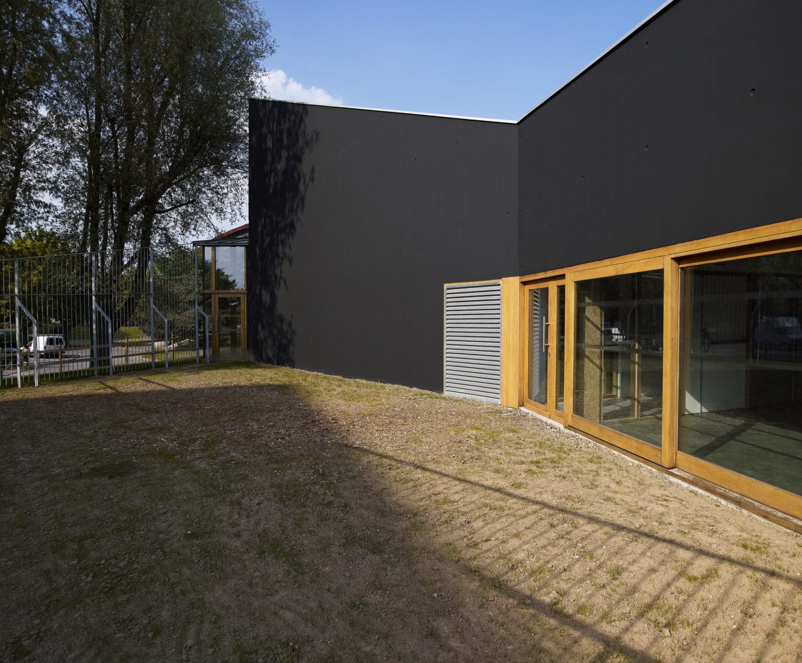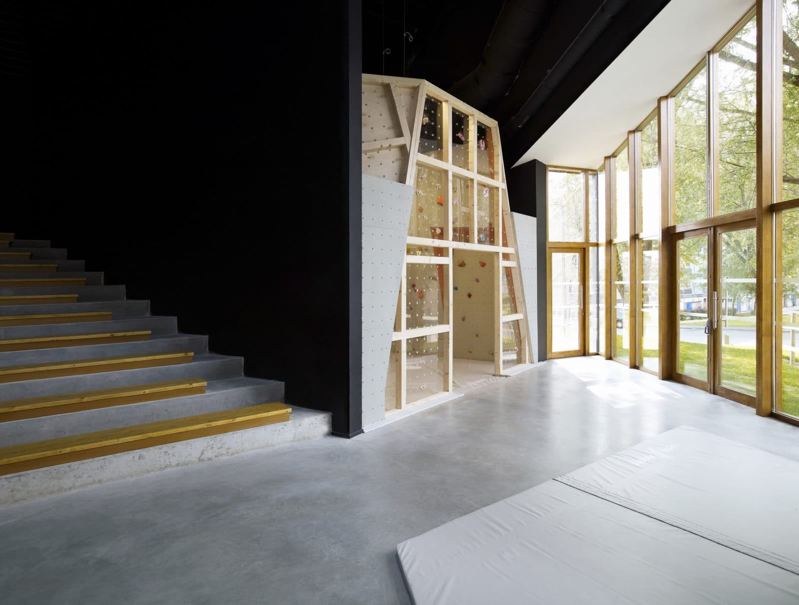 Ce jeu est mis à l’honneur en traitant la salle avec une tribune frontale. Les gradins sont d’une grande simplicité avec une assise en bois venant se poser sur les marches en béton. La salle de musculation est traitée dans un volume plus compact avec une hauteur sous plafond plus faible dans une atmosphère contenue par des panneaux OSB. Elle est ventilée par deux séries de baies de part et d’autre de la salle.