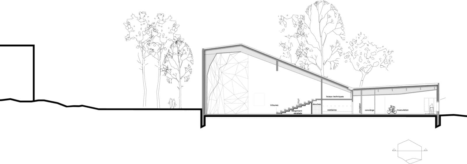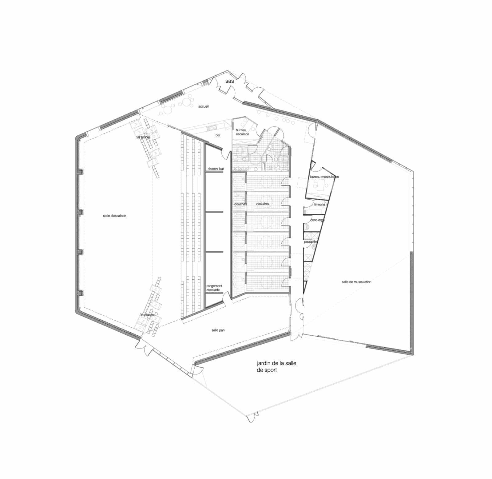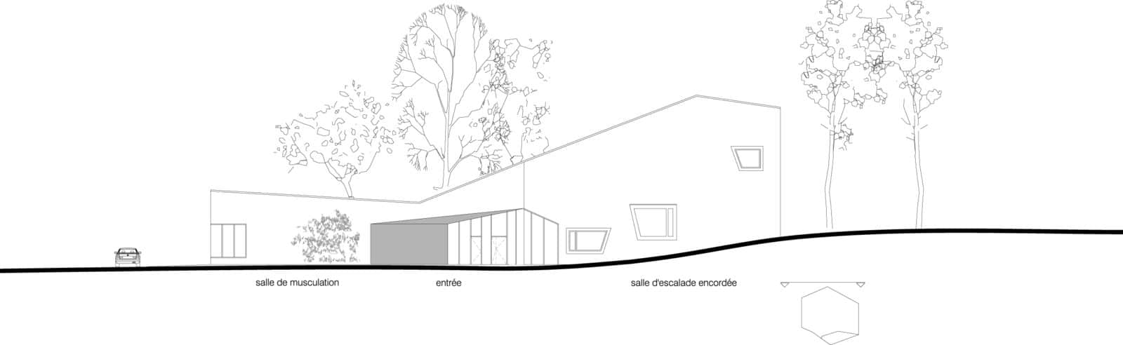 Le bâtiment se pose au centre du terrain sur un plan hexagonal. La salle de musculation et la salle d’escalade sont séparées par un bloc central concentrant les sanitaires et les services. Remarquons  que pour des questions techniques, le voile du mur d’escalade est renforcé par quatre poteaux en BA. Les panneaux propres à l’exercice viennent ensuite s’accrocher sur cette structure laissant plus de liberté pour l’organisation du jeu.