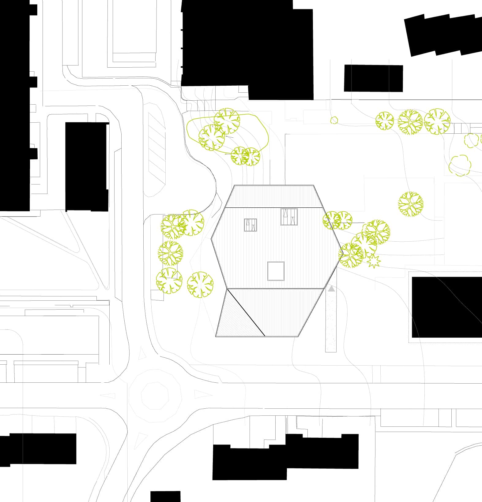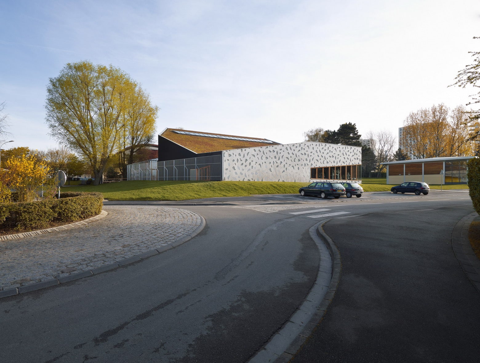 Le projet s’implante dans ce centre-ville rythmé par des barres et des tours des années 70. La parcelle profite d’un angle de rue et de la présence d’arbres qui sont conservés. Le terrain est adouci grâce à une pelouse garnissant l’ensemble du terrain dégageant au passage les vues autour du bâtiment pour le mettre en avant. L’activité de l’escalade étant peu pratiquée dans cette région.