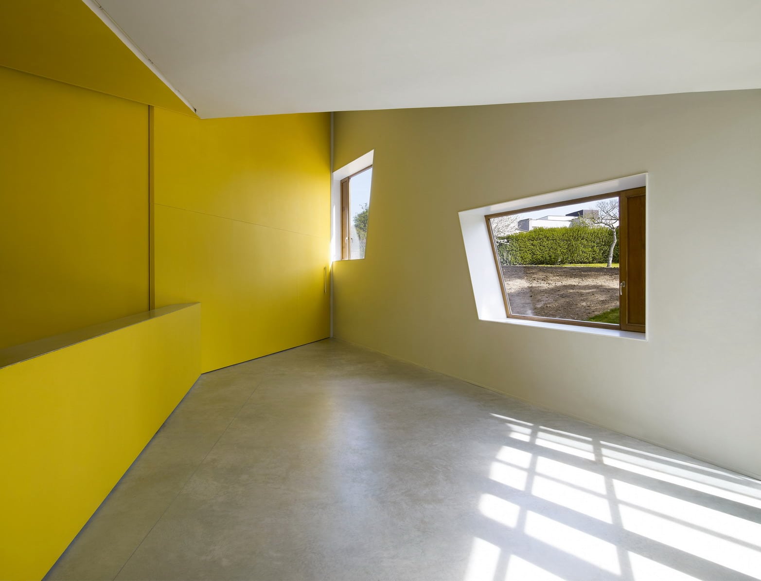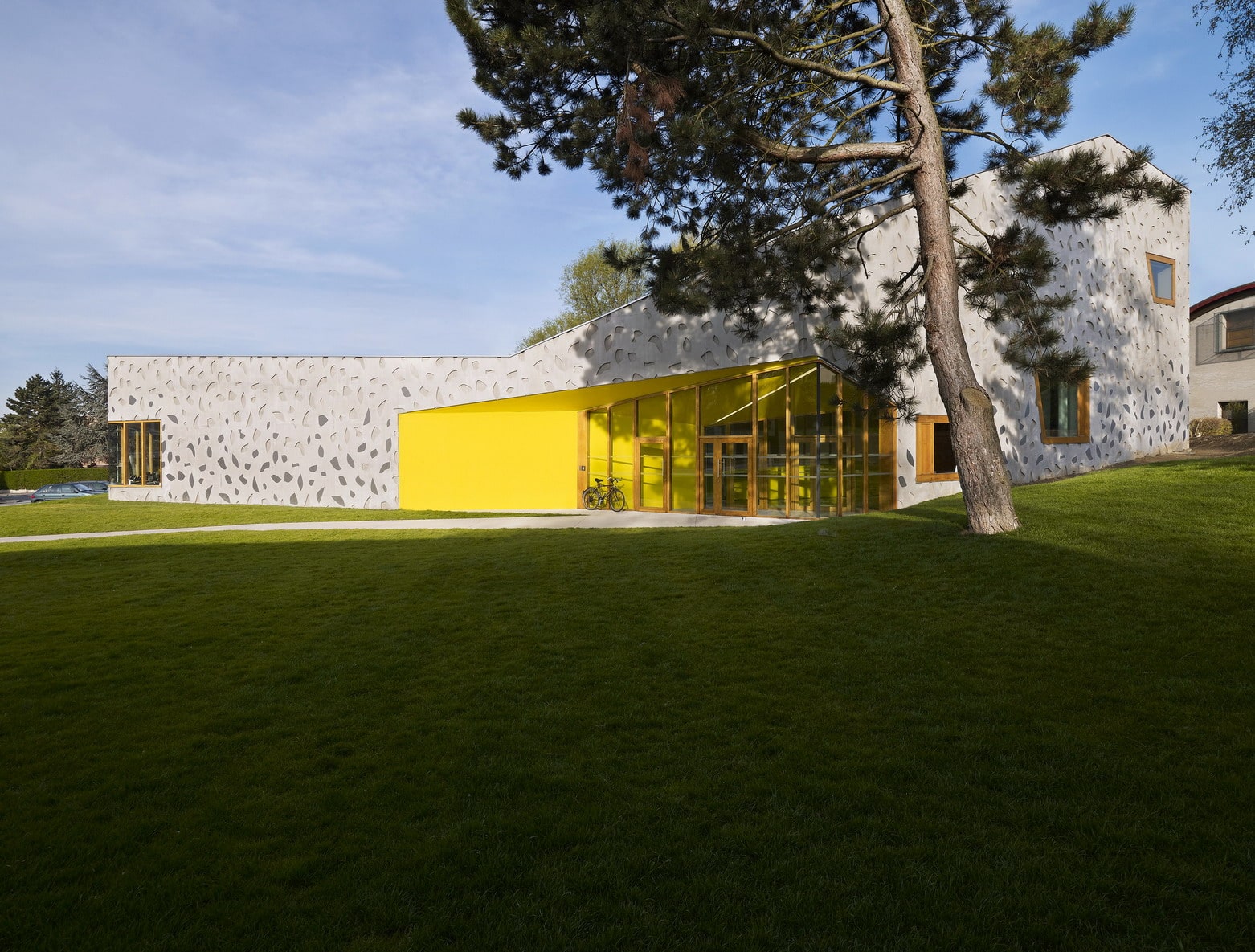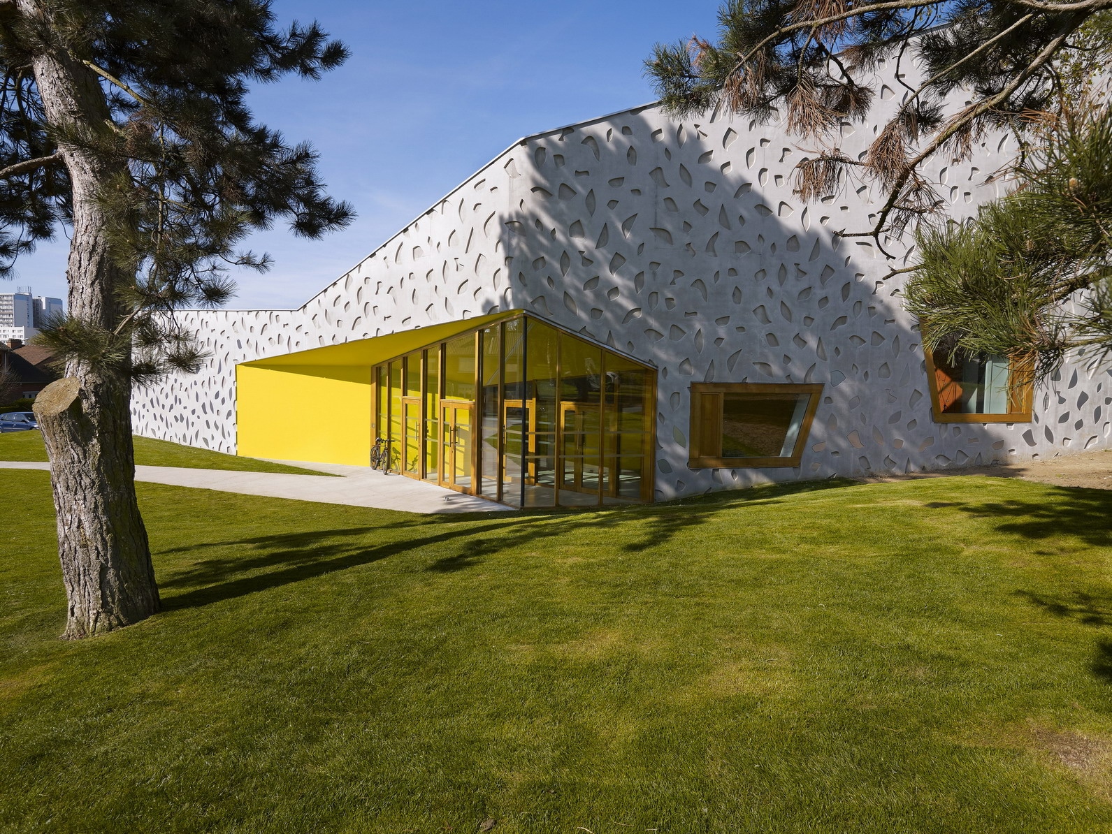 Le jeu des accroches est repris pour le traitement extérieur des façades à travers un béton moulé d’un seul trait. Les voiles sont percées de manière aléatoire par des fenêtres trapézoïdales aux châssis imposants en bois qui font office de liaison avec la couleur vive des murs intérieurs. Les architectes redonnent l’emprise du bâtiment par une semée quatre saisons en toiture.