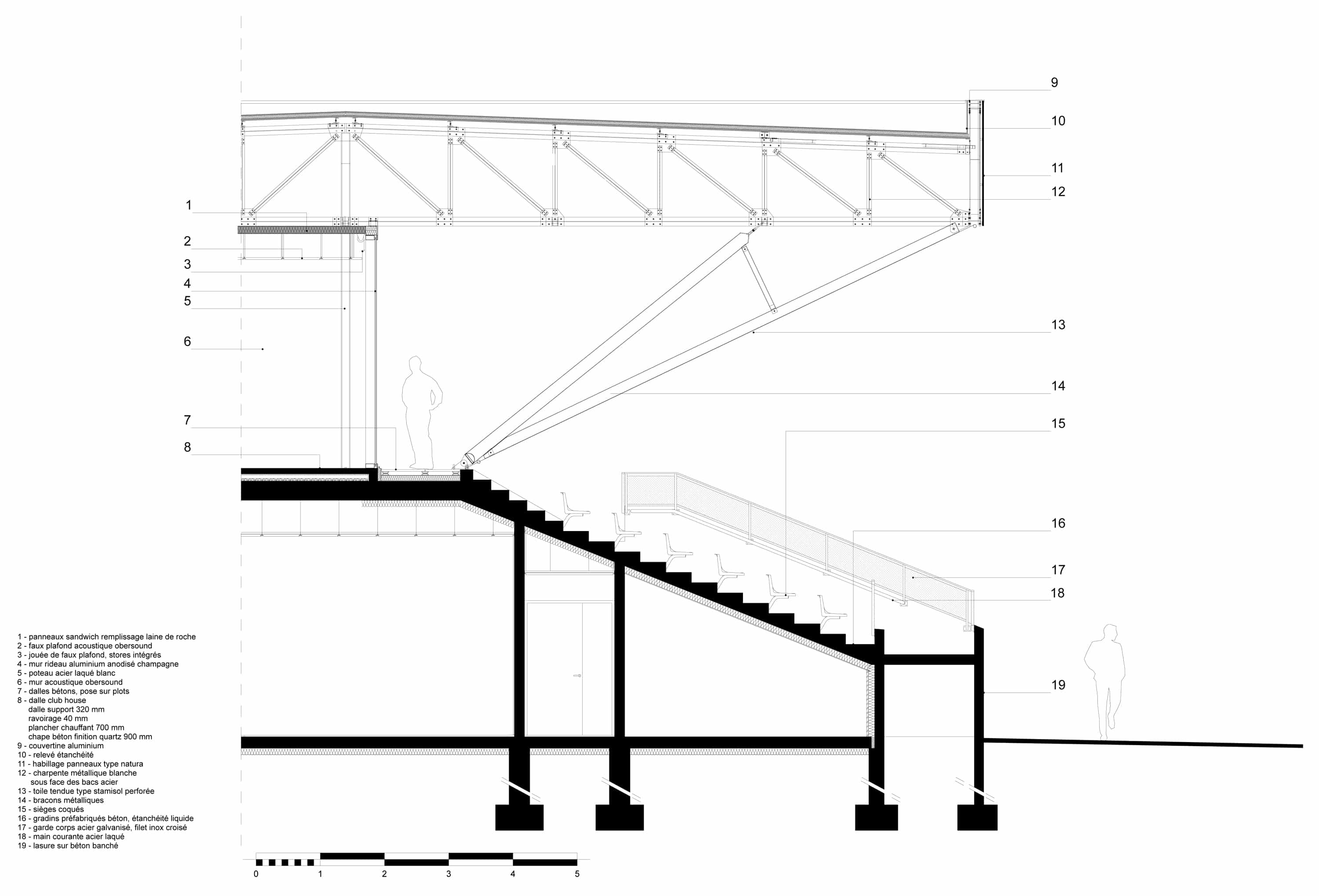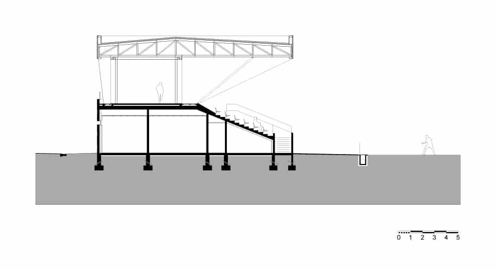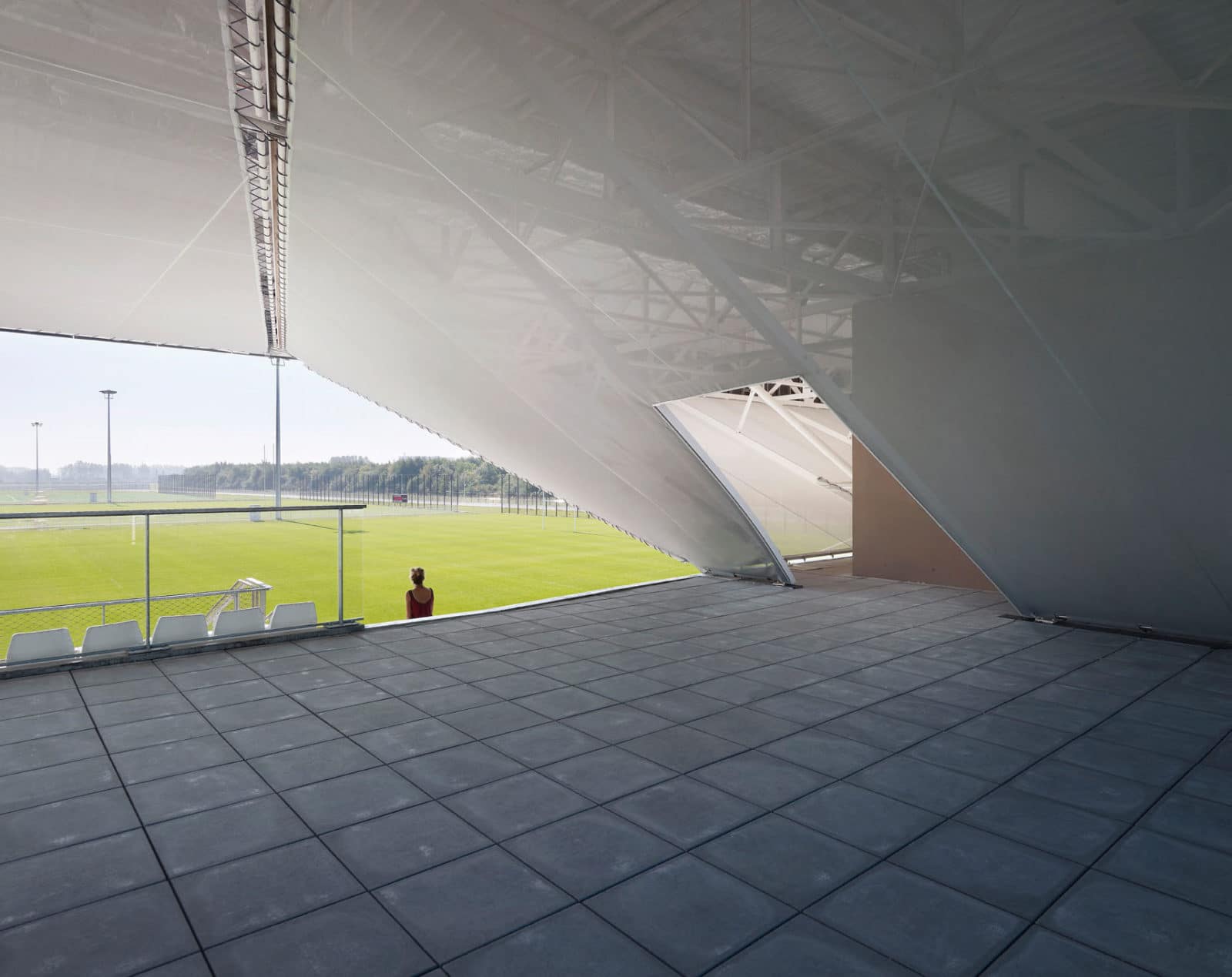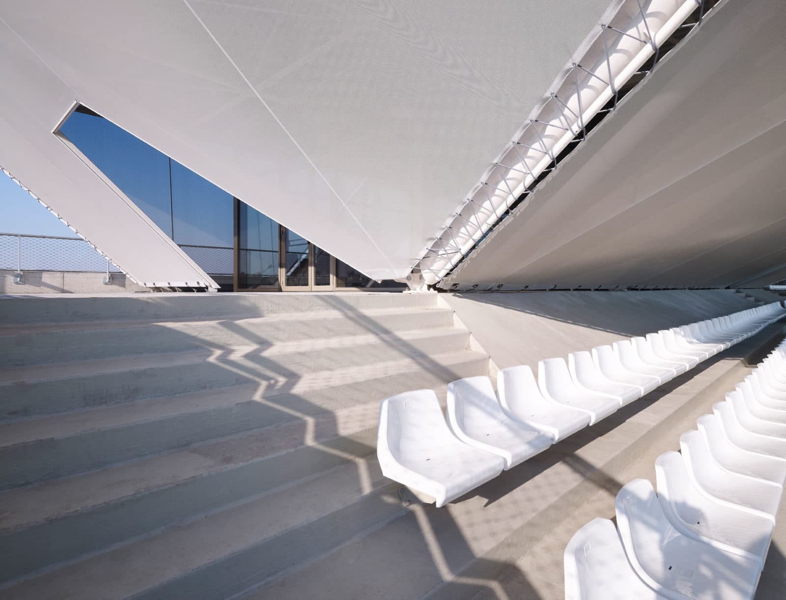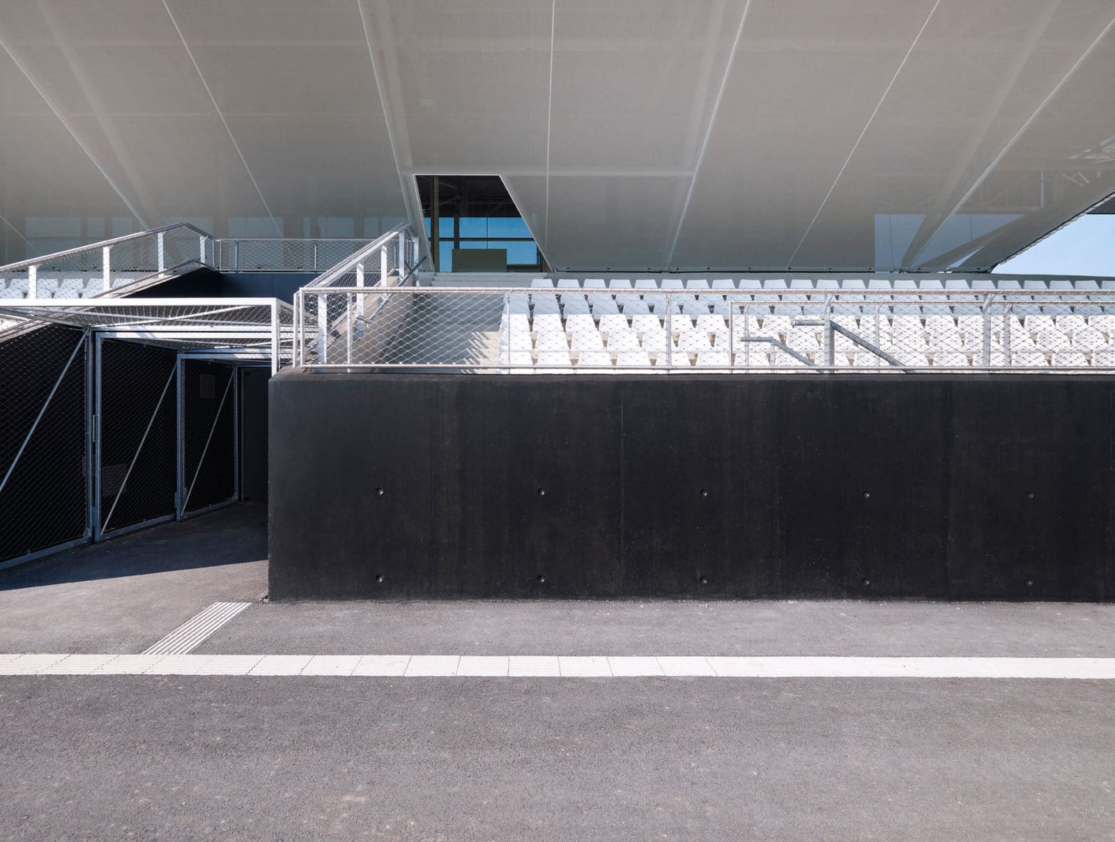 Avec une base parallélépipédique, le volume est coupé puis évidé pour modeler les tribunes. Le projet regroupant notamment les bureaux de clubs de d’autres disciplines, les architectes ont souhaités ouvrir cette tribune aux autres sports à travers une percée transversale au centre du bâtiment. Cette terrasse offre des vue sur le paysage environnement et le parc sportif. Elle mène à une coursive permettant aux adhérents de traverser la voie en toute sécurité.