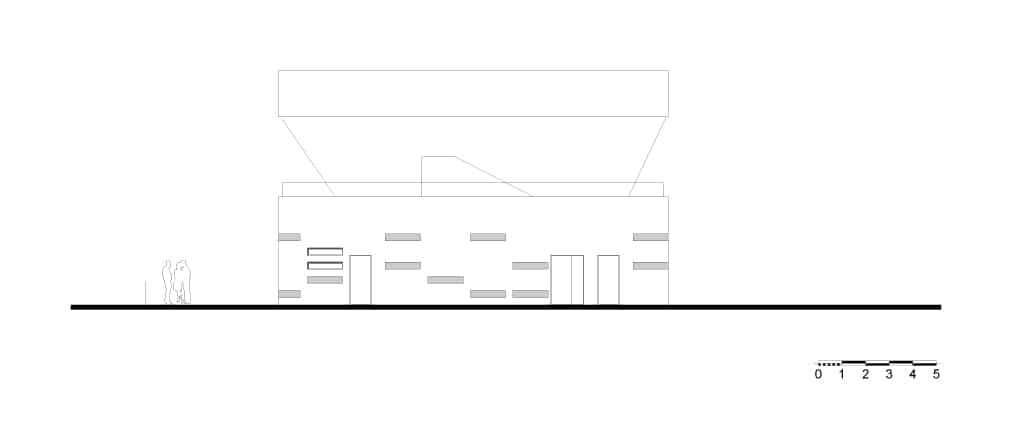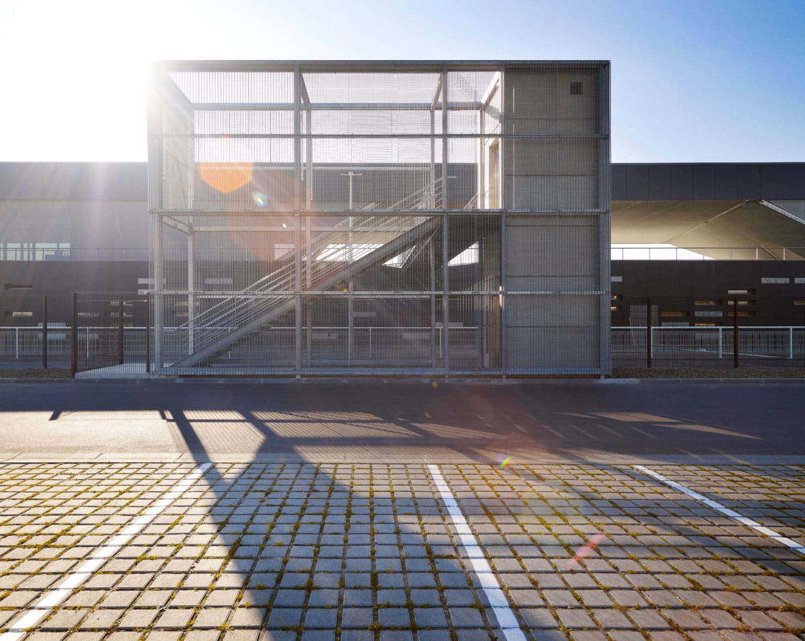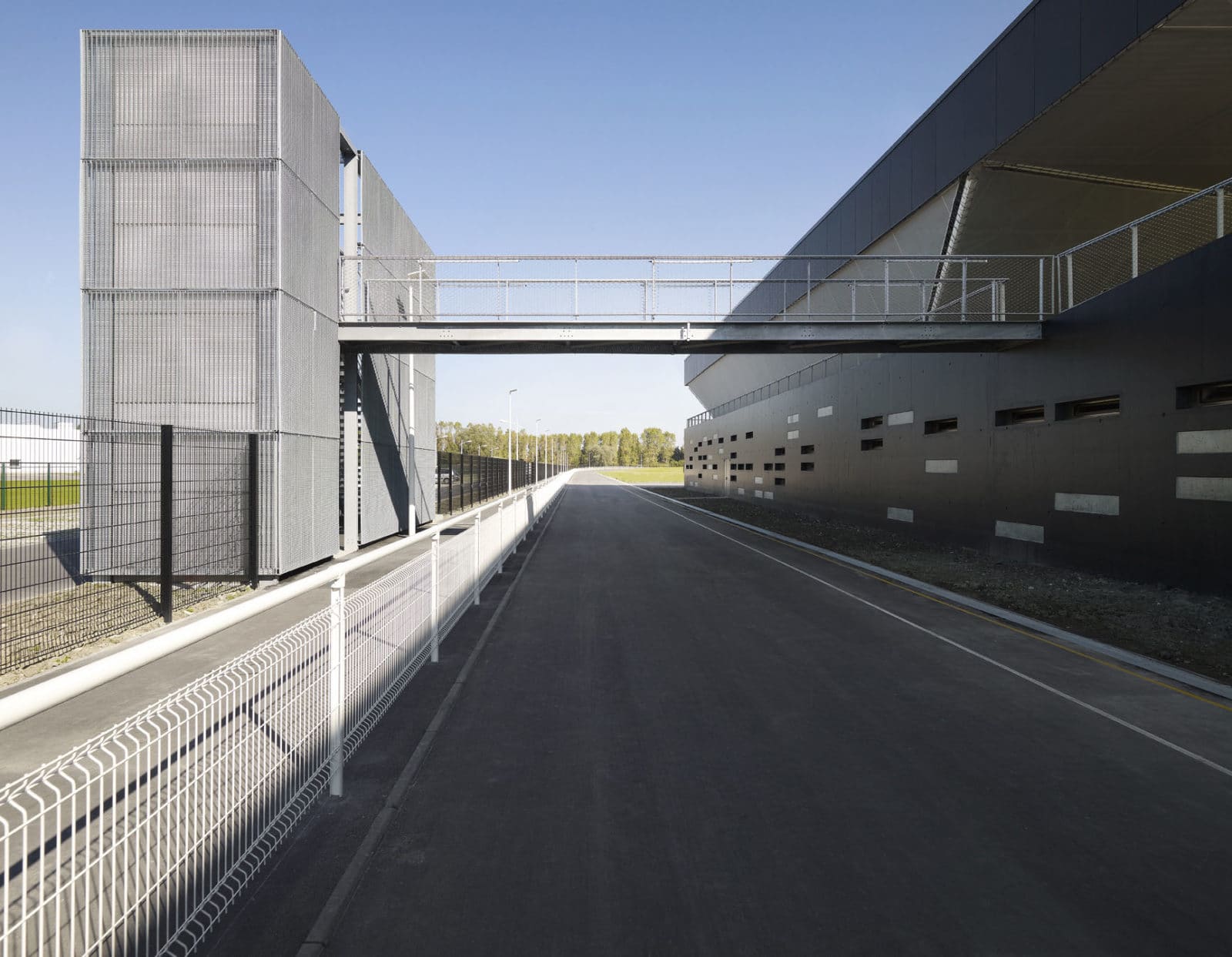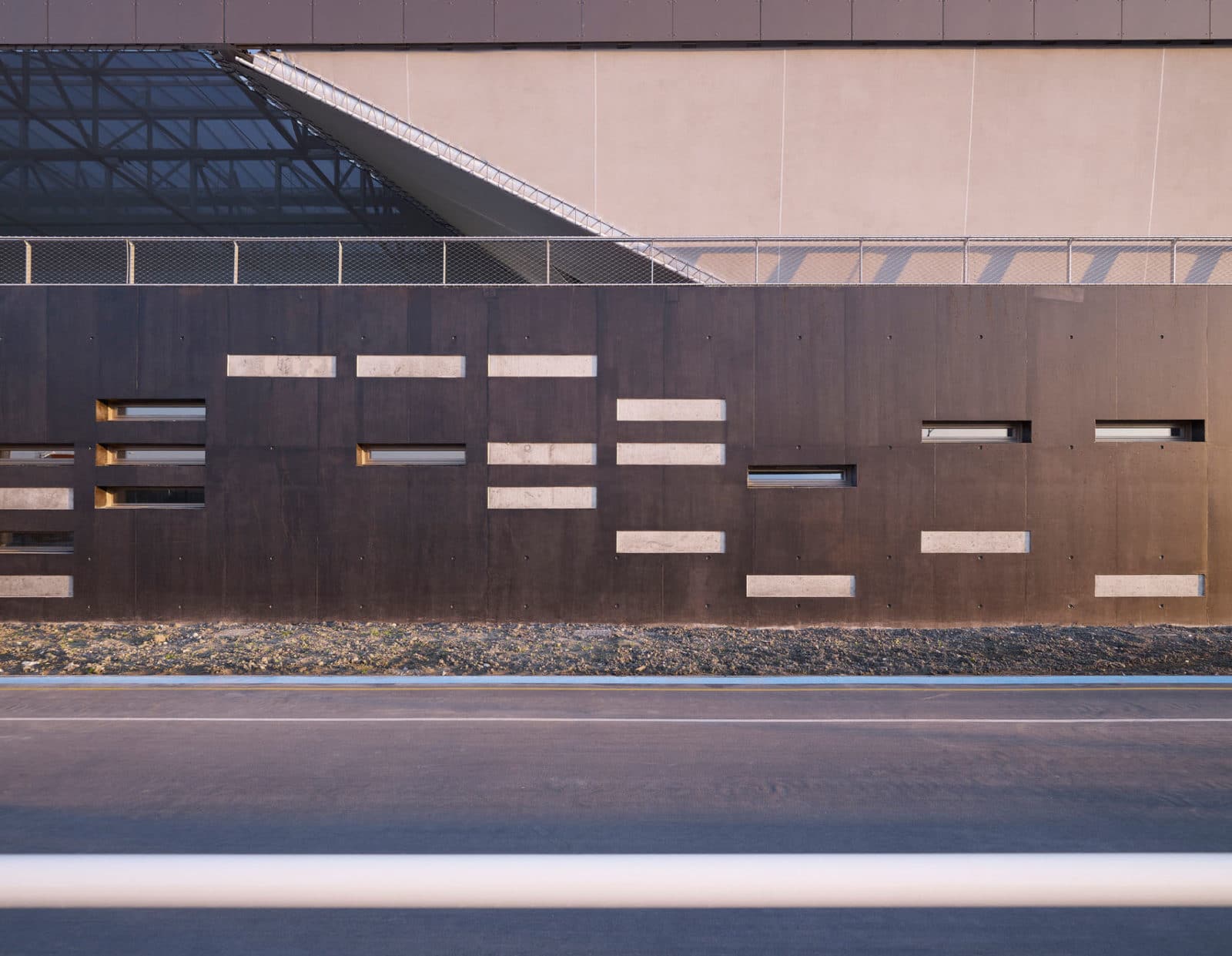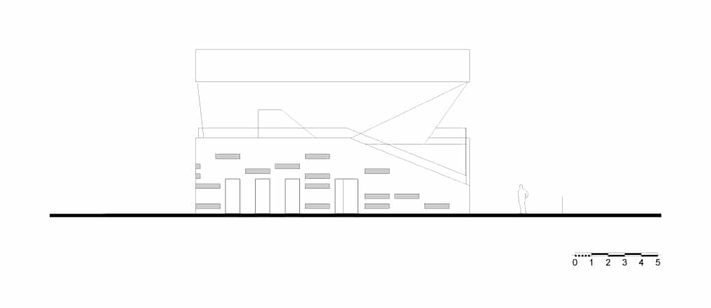 Avec une base parallélépipédique, le volume est coupé puis évidé pour modeler les tribunes. Le projet regroupant notamment les bureaux de clubs de d’autres disciplines, les architectes ont souhaités ouvrir cette tribune aux autres sports à travers une percée transversale au centre du bâtiment. Cette terrasse offre des vue sur le paysage environnement et le parc sportif. Elle mène à une coursive permettant aux adhérents de traverser la voie en toute sécurité.