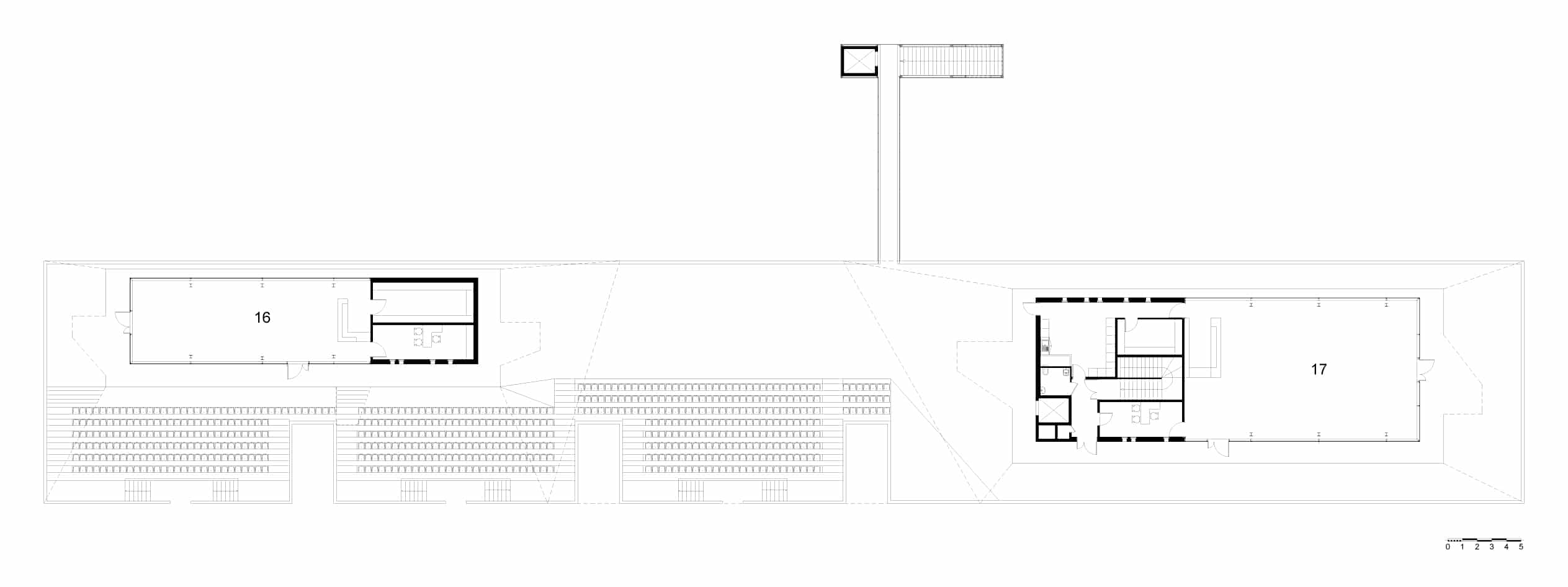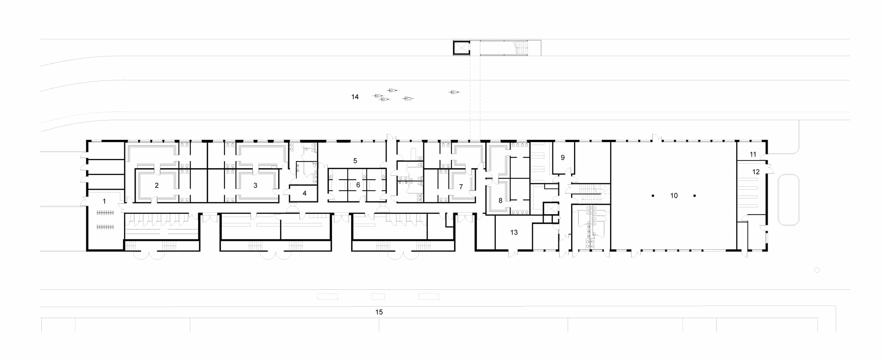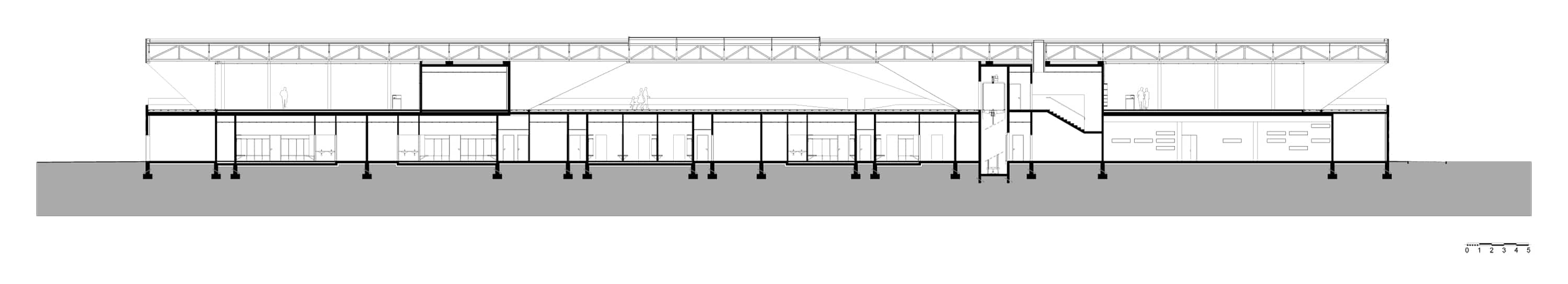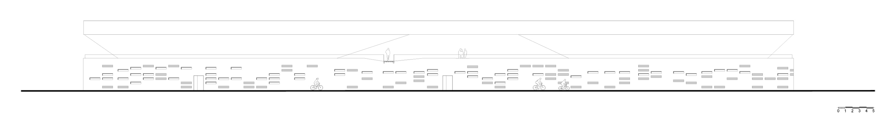 Avec une base parallélépipédique, le volume est coupé puis évidé pour modeler les tribunes. Le projet regroupant notamment les bureaux de clubs de d’autres disciplines, les architectes ont souhaités ouvrir cette tribune aux autres sports à travers une percée transversale au centre du bâtiment. Cette terrasse offre des vue sur le paysage environnement et le parc sportif. Elle mène à une coursive permettant aux adhérents de traverser la voie en toute sécurité.