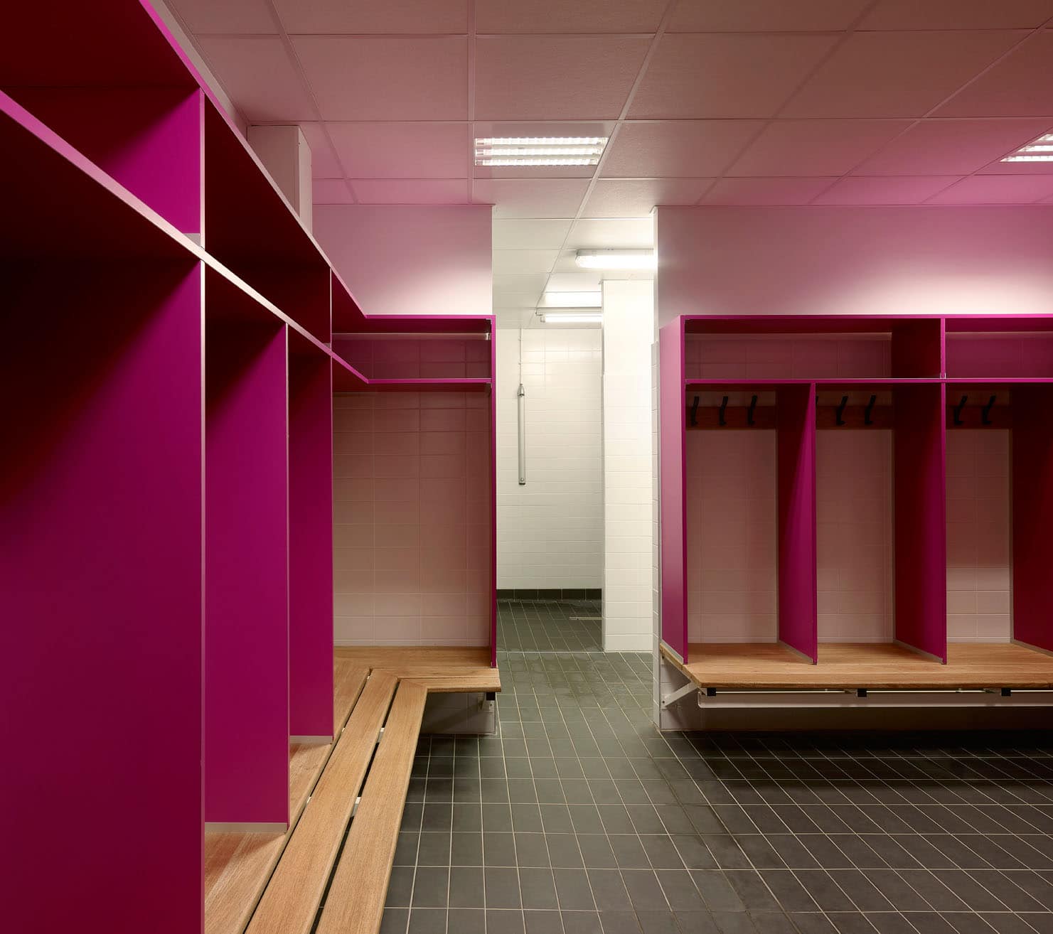 Les installations sont unifiées par une seule toiture métallique en bac acier et un seul socle en béton lasuré. Les choix des matériaux étaient restreints par le programme. Le socle de l’édifice abrite les vestiaires pour les footballeurs et les rugbymans, un sauna (n°4 sur le plan), une salle polyvalente (n°10) et une salle de musculation (n°5). Le club de cyclisme (n°16) et le club de rugby (n°17) se situe à l’étage du bâtiment, il bénéficie d’une vue privilégiée sur le parc avec de grande baies vitrées tout en restant discret vis-à-vis du public grâce à la toile tendue type stamisol perforée.