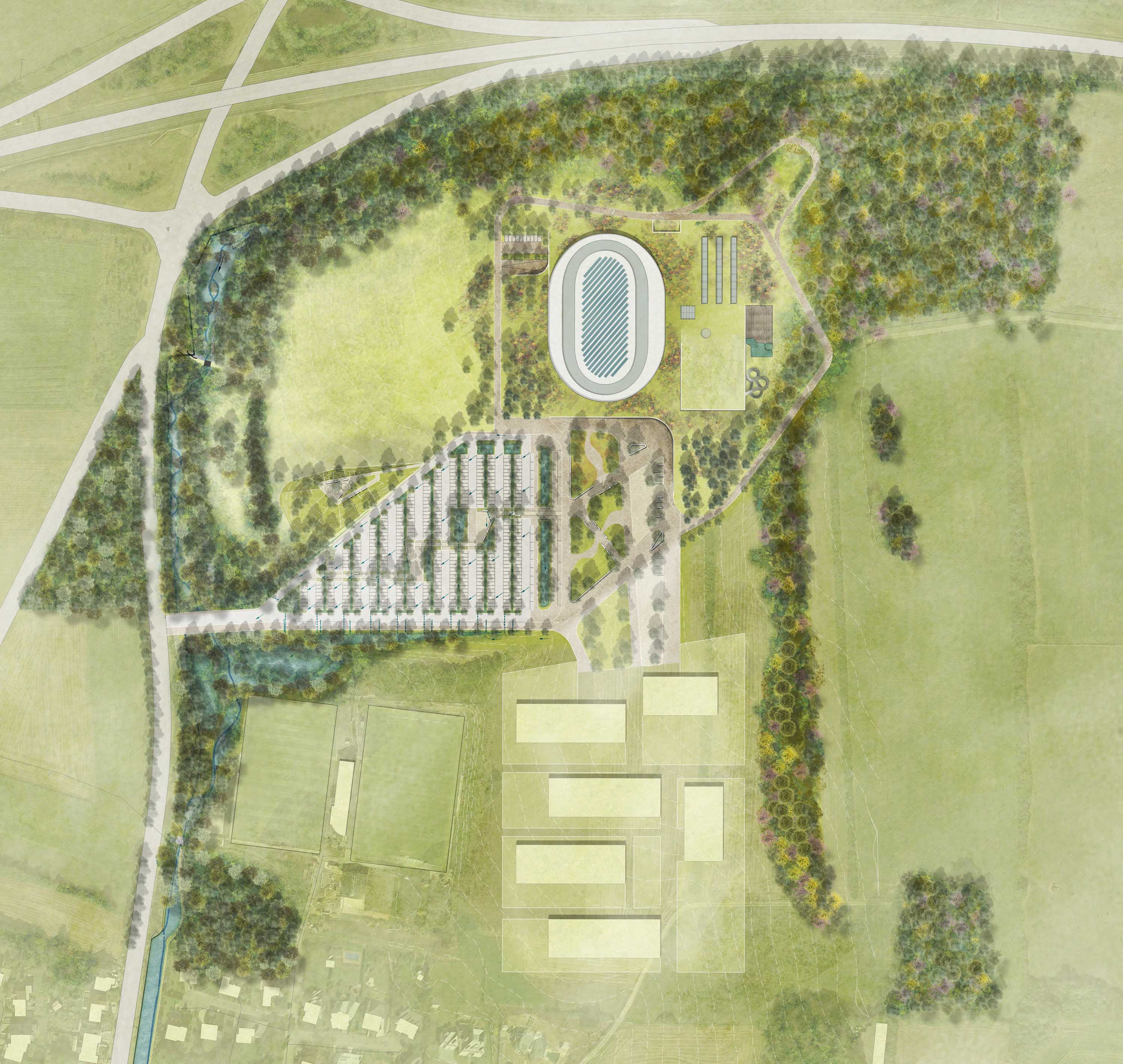 Aujourd’hui, les derniers complexes sportifs français offrent de larges bandeaux vitrés au RDC et sont de plus en plus terminés par des façades en polycarbonate pour une nouvelle fois faire la part belle à la lumière naturelle. Le projet de Metaform et de Mecanoo prend un autre parti, puisque le projet s’insère dans un tissu très rural, c’est à la nature que le projet déroule le tapis rouge. Les architectes ont ainsi créé une nappe de terre végétale à base carré qui vient se décoller d’un socle minéral. Entre les deux, une faille vient alors glisser le complexe sportif.